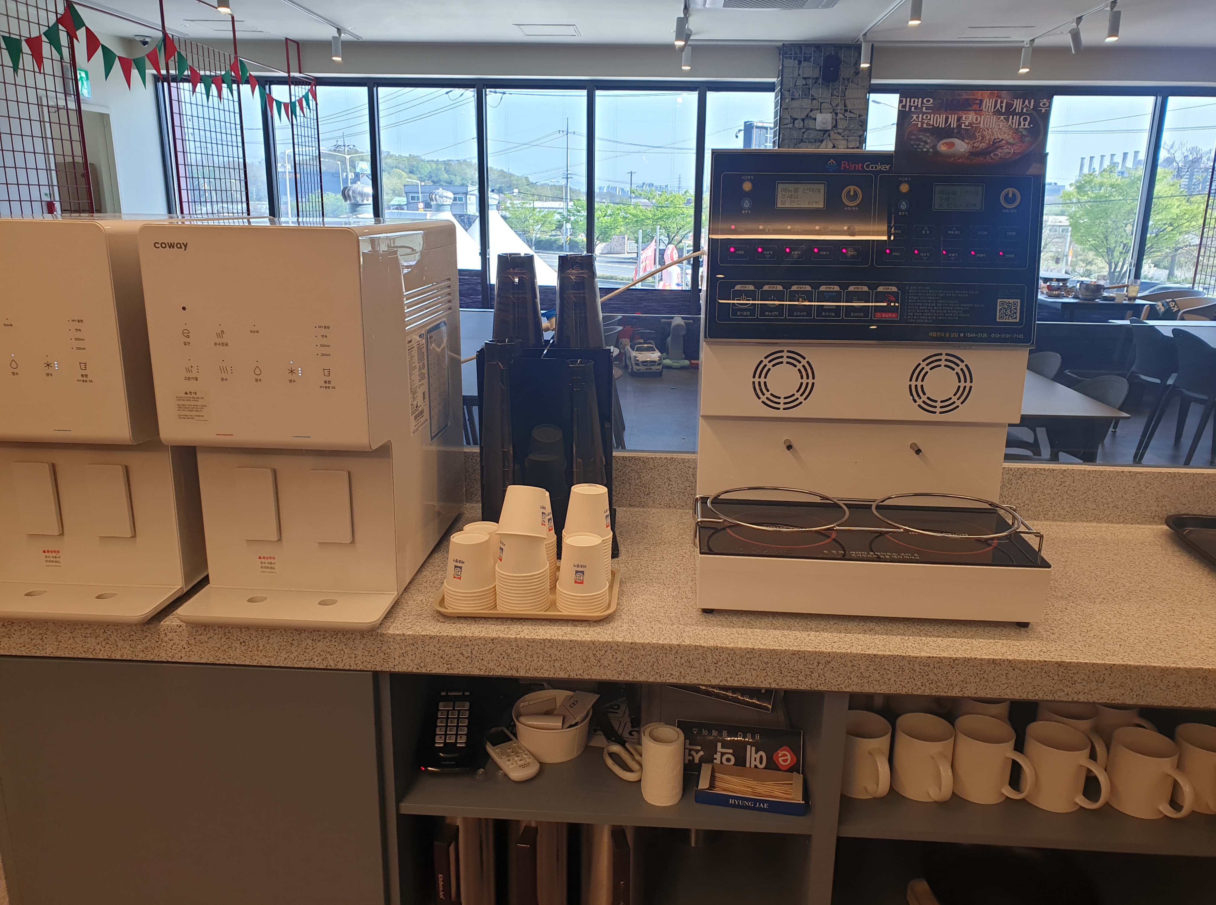 BBQ PLACE 매장 셀프코너에는 상추 등 야채를 씻을 수 있는 싱크대가 있으며, 그릇과 수저, 가위, 집게, 호일, 라면머신, 커피머신, 정수기, 전자레인지, 제빙기 등도 준비되어 있다.
