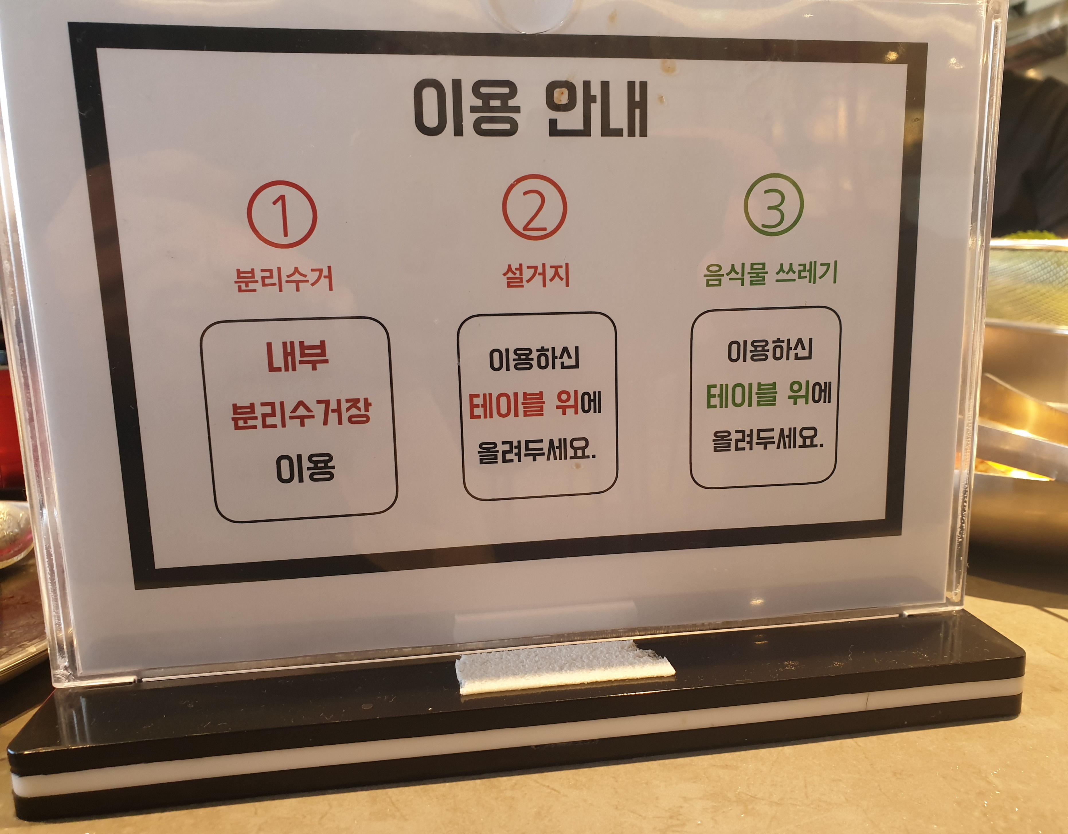 테이블 타임 종료 10분전에 테이블을 미리 정리해야 하는데, 식기나 음식물 쓰레기 등을 그냥 놔두라고 테이블에 안내되어 있지만, 대부분 깔끔하게 치우는 모습이었고 우리 일행도 깨끗하게 치우고 나왔다.