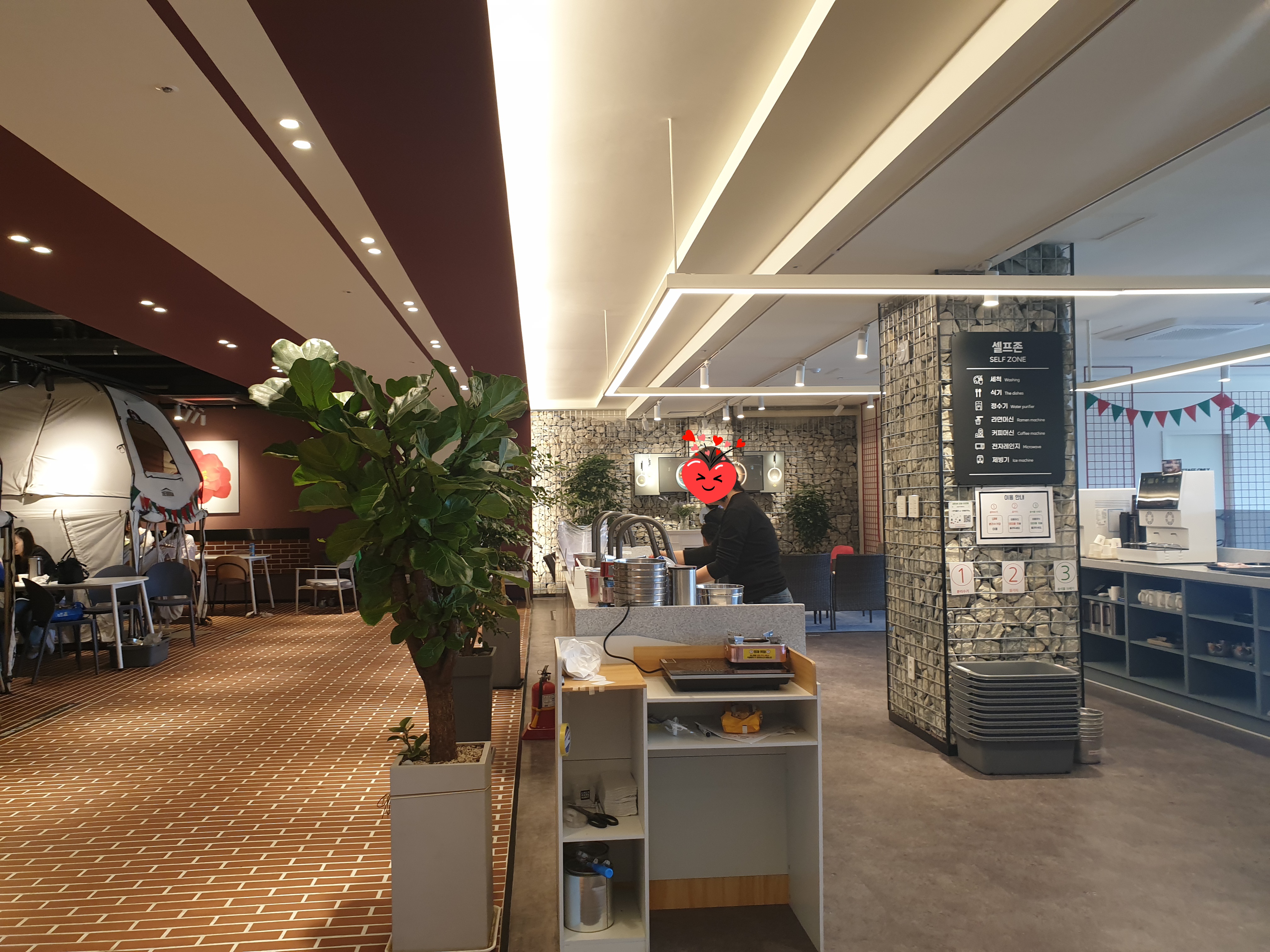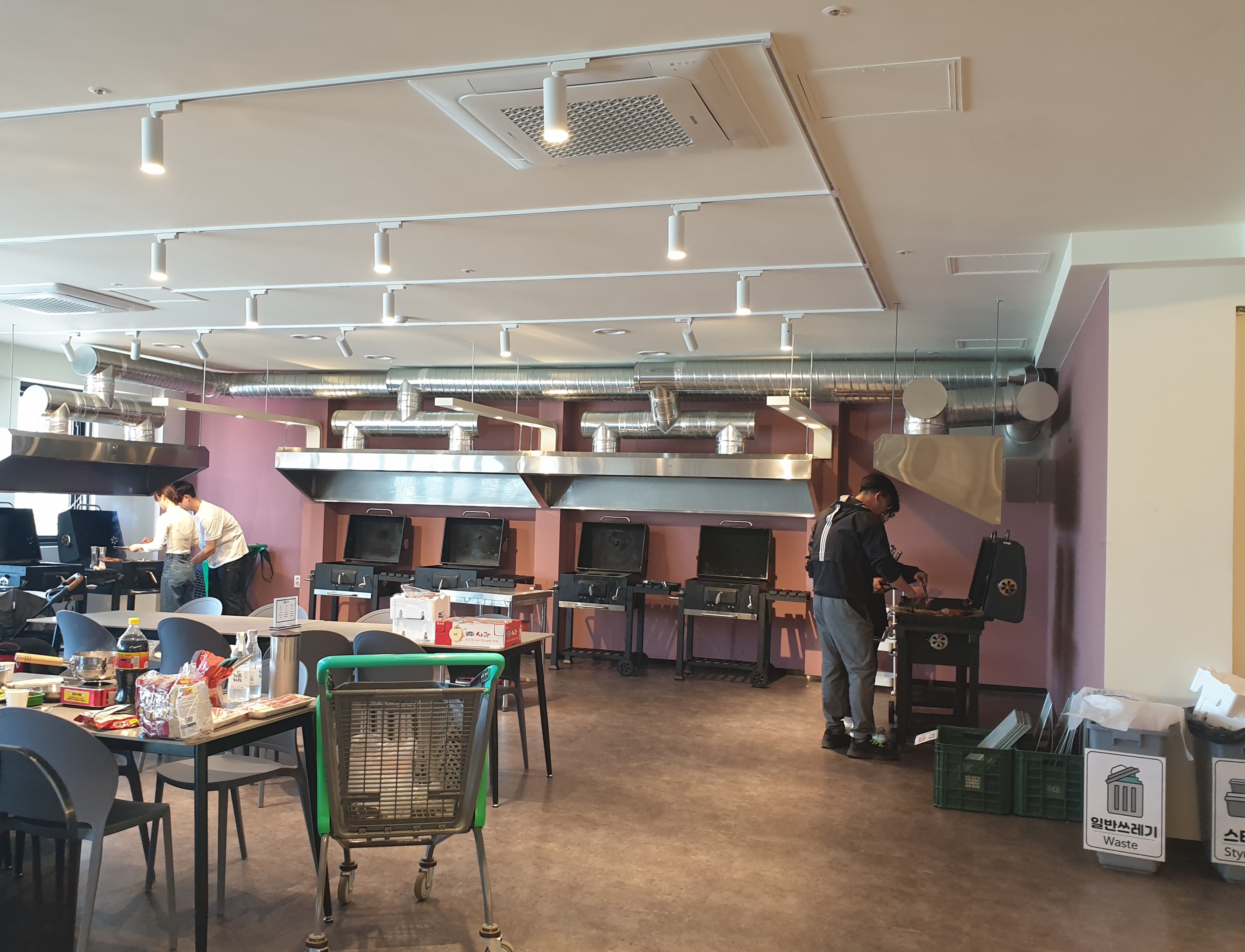 4. 이용방법 : 1층 이플러스마트(E-PLUS FOODS MARKET)에서 식음료를 구입하여 직접 화로에서 구워 먹는 방식으로 외부 음식 반입은 금지하고 있다.