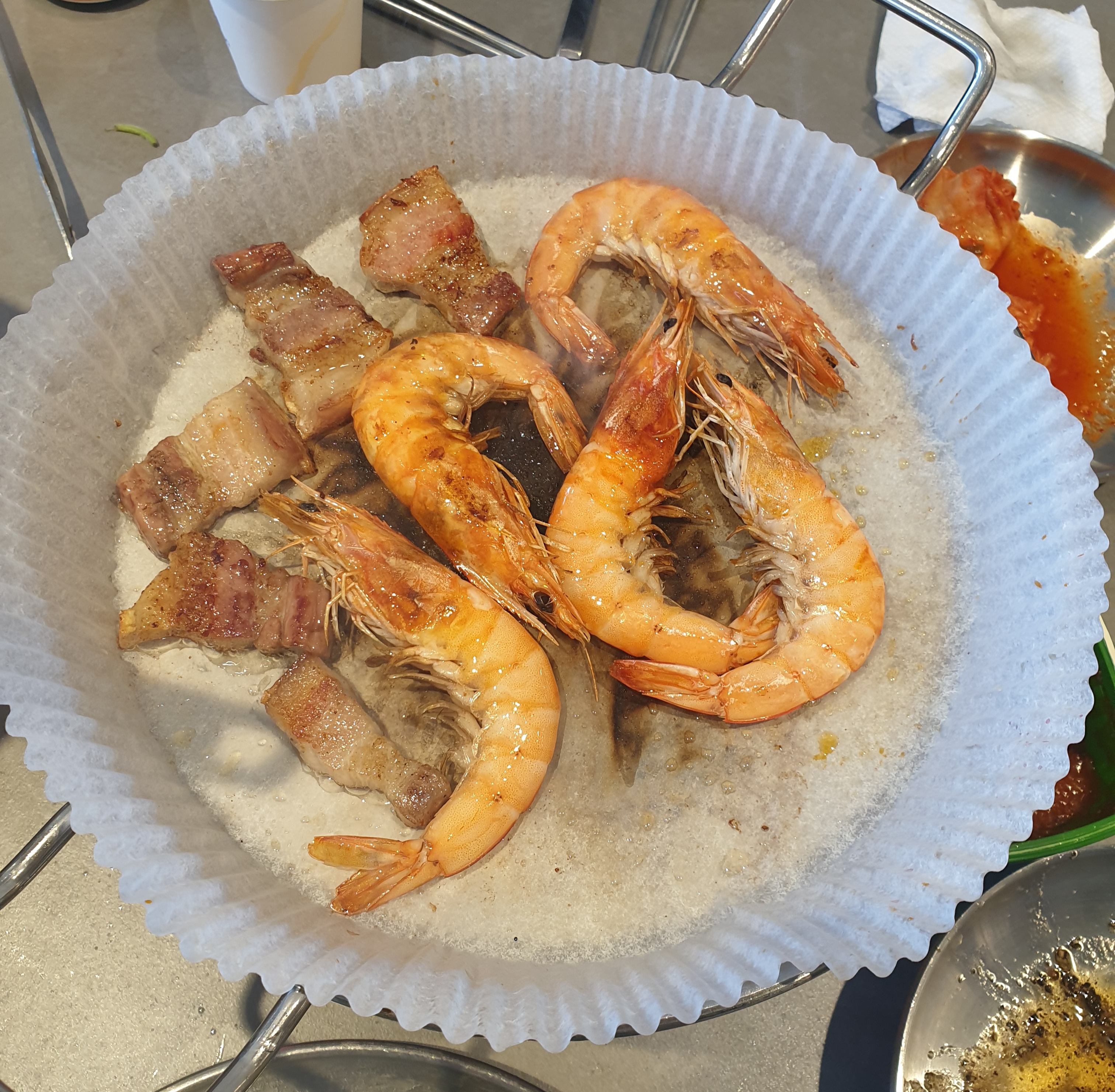 노릇노릇하게 익어가는 통통한 새우도 먹음직스럽게 보인다. 실제도 꼬들꼬들 바다의 짠맛과 함께 간이 되어 맛이 있다.