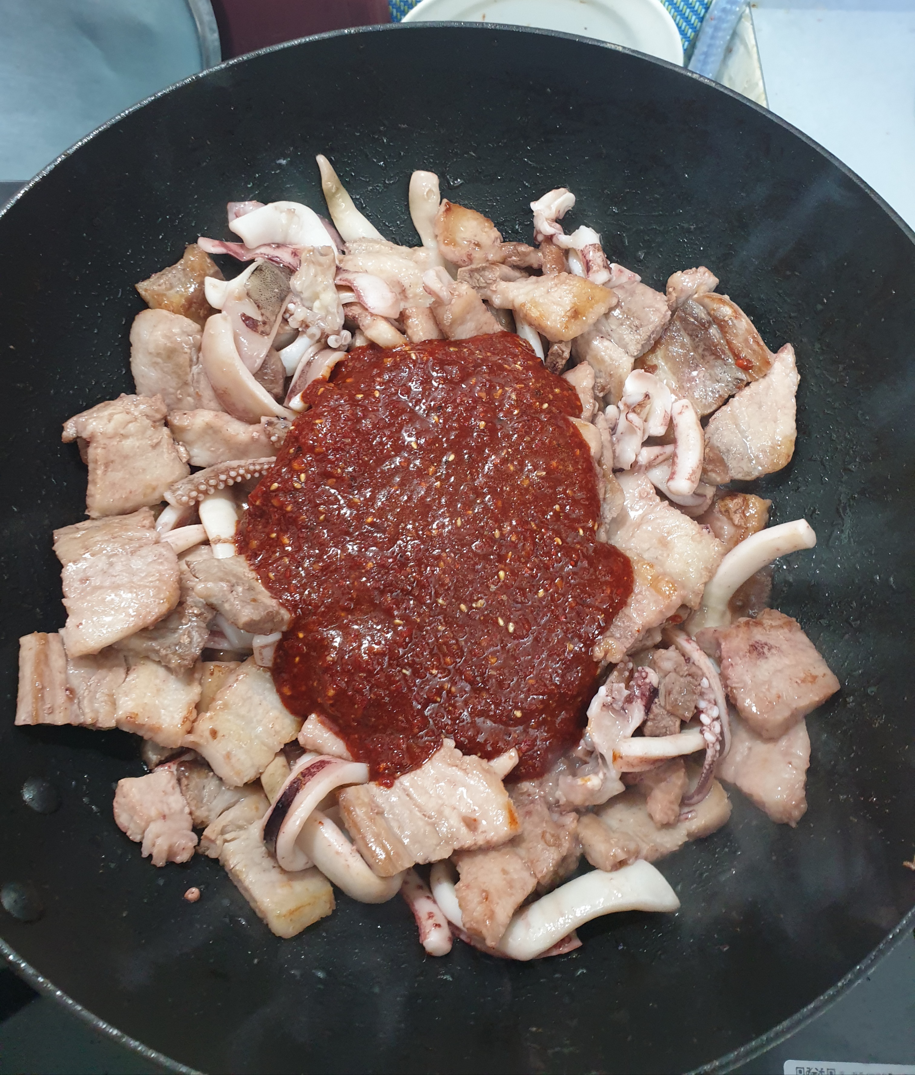 삼겹살과 오징어를 적당히 볶은 후, 준비한 양념장을 투하한다.