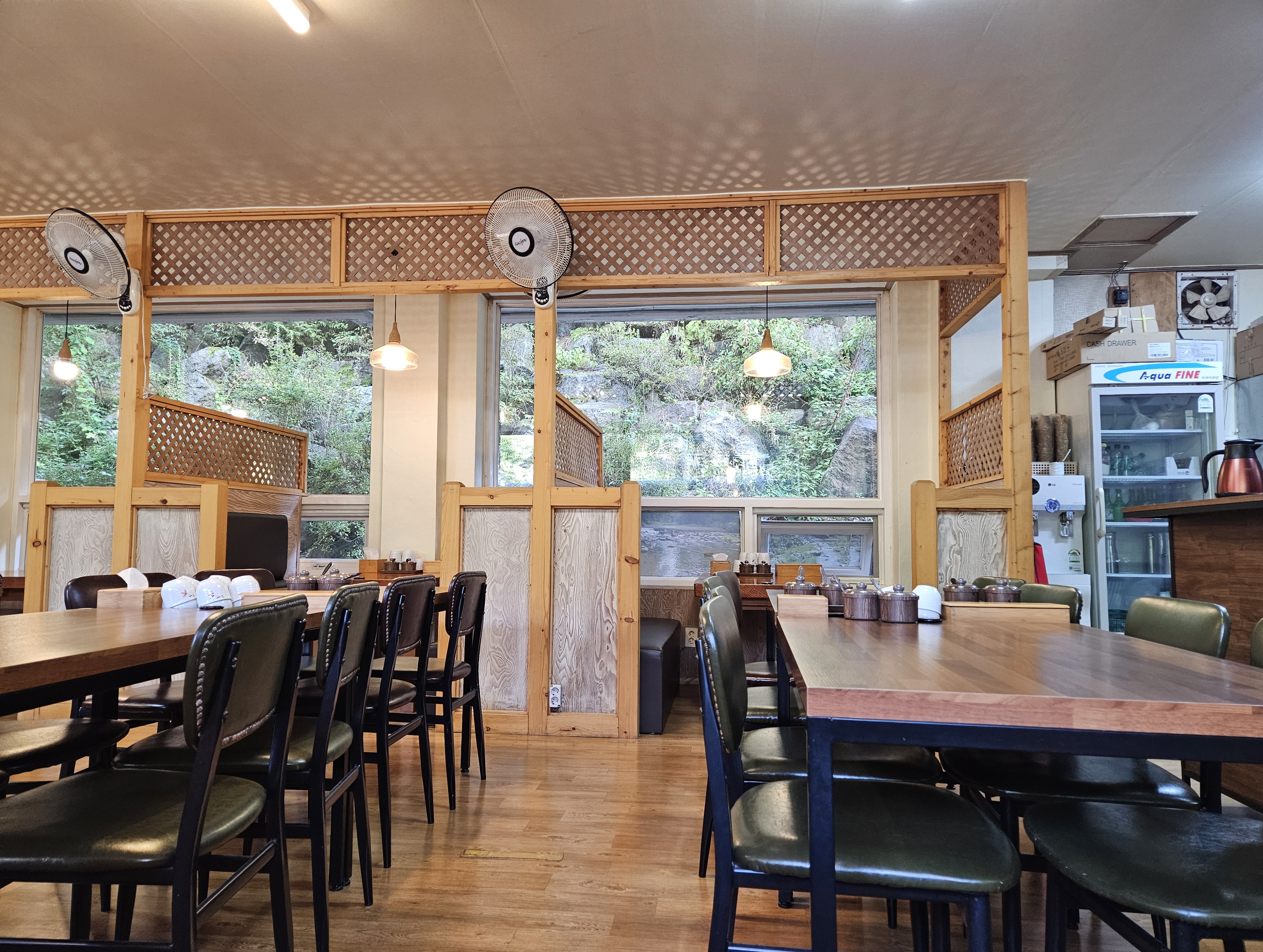 식당 내부는 사진에서 보듯이 깔끔하고 깨끗하였으며, 식사는 내부 또는 외부에서도 먹을 수 있으며 우리 일행은 날씨가 좀 쌀쌀하여 내부에서 식사를 했는데, 외부 계곡옆에서 식사하는 팀도 두 팀이나 있었다.