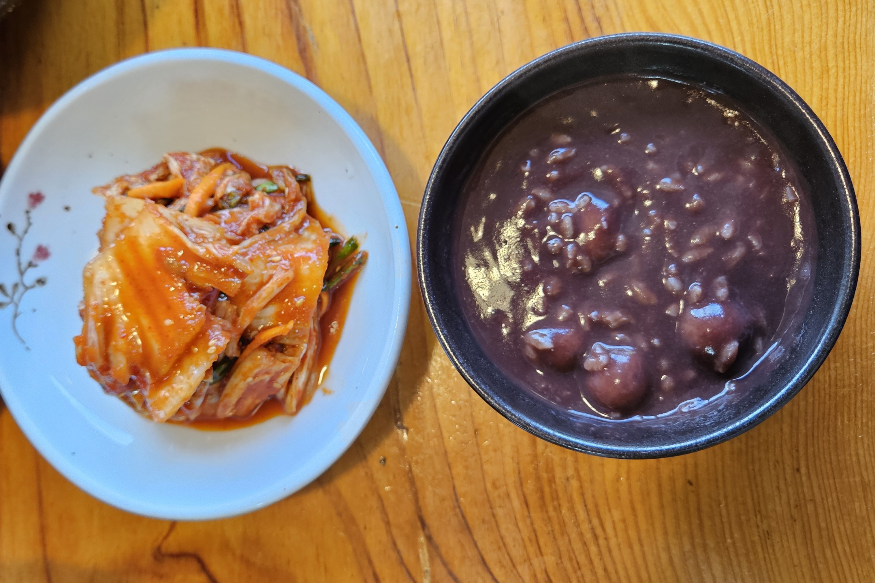 메인 음식이 나오기전에 붉은색을 띤 따뜻한 팥물이 제공된다. 밑반찬으로는 예로부터 팥죽과 어울린다는 겉절이 배추김치와 백김치 두 가지가 나오는데, 이 또한 별미다. 아래 사진에서 보듯이 신선한 재료를 사용해서인지 정갈하고 깨끗한 모습으로 보기만 해도 먹음직스럽고 실제도 시원하고 상큼한 맛이다.