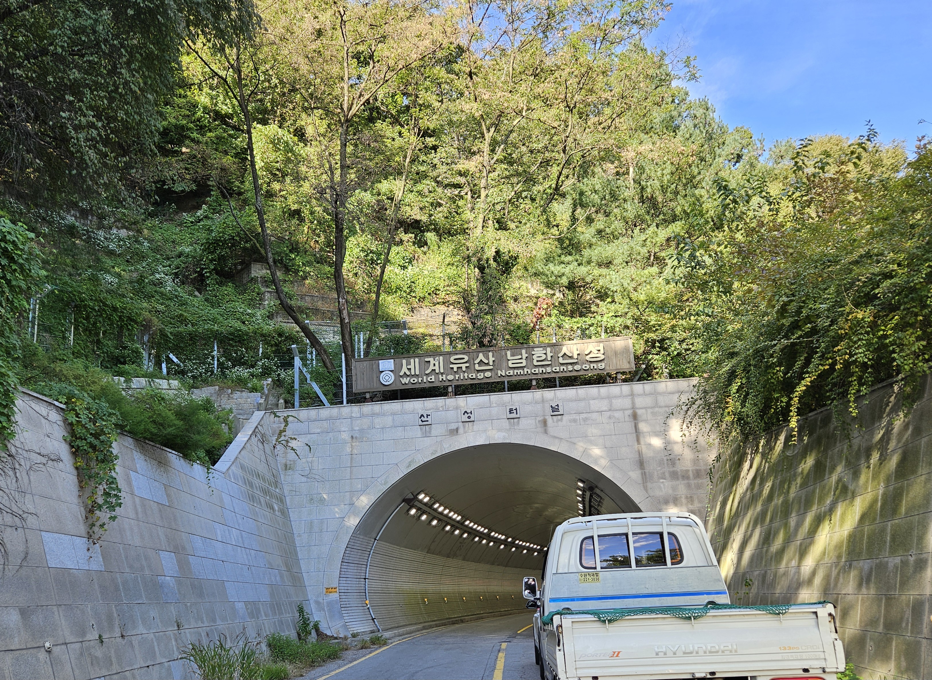 세계유산 남한산성이라고 쓰여있는 터널로 터널만 지나면 남한산성의 분지가 나오면서 궁궐과 마을 등이 펼쳐진다. 이런 산속에 그런 큰 분지가 있으리라 예상을 못하기에 인조 임금도 백성을 버리고 이쪽으로 피신한 듯하다. 비록 삼전도의 굴욕을 당했지만..