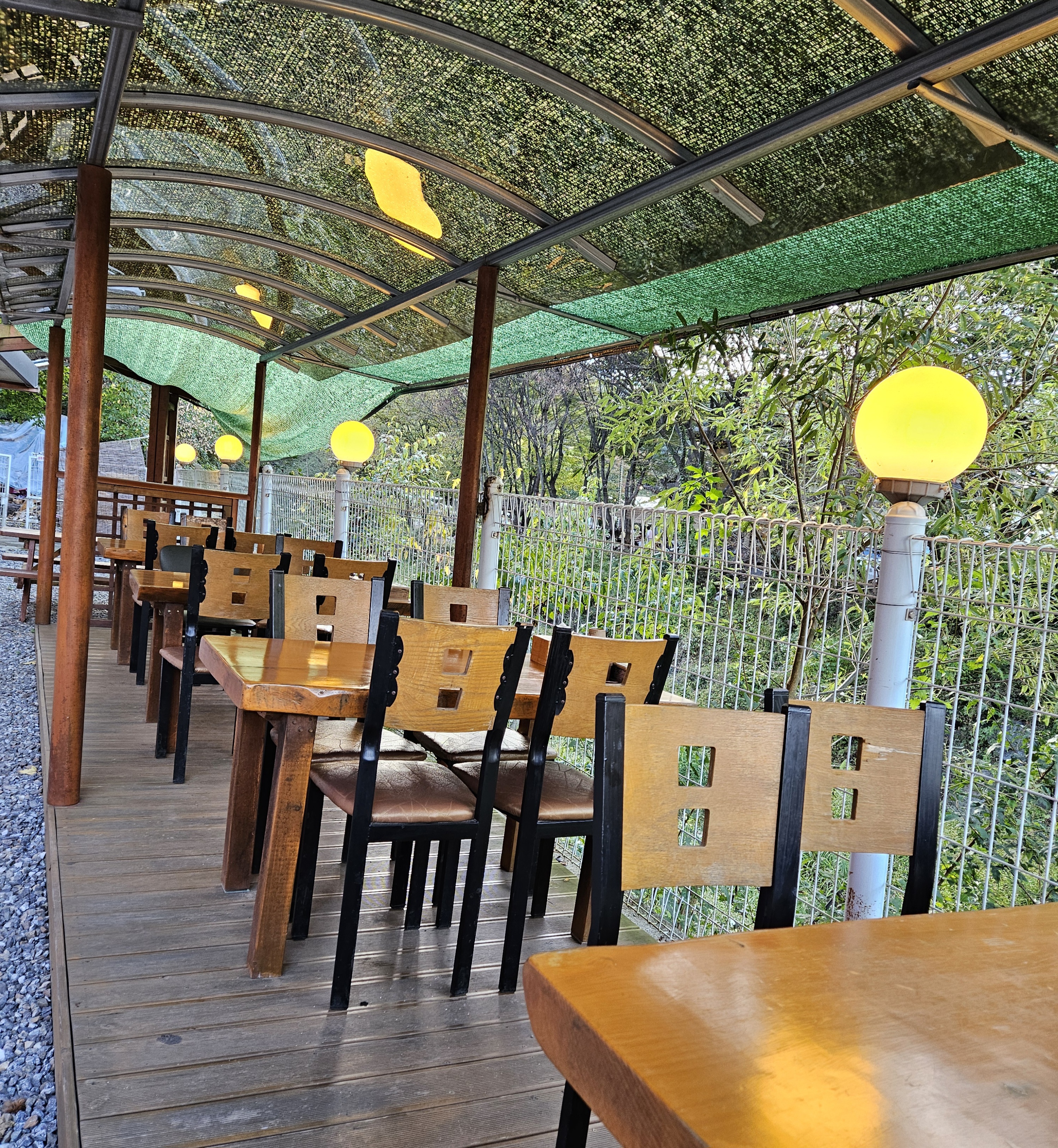 식당 앞에도 좌석이 있는데 바로 옆에 계곡물이 흐르고 있어 운치 있는 환경에서 식사를 즐길 수 있다. 우리 일행이 식당에 들어설 때에는 두 팀이 있었으나, 먹고 나오니 비워 있었기에 사진도 편하게 촬영하였다.