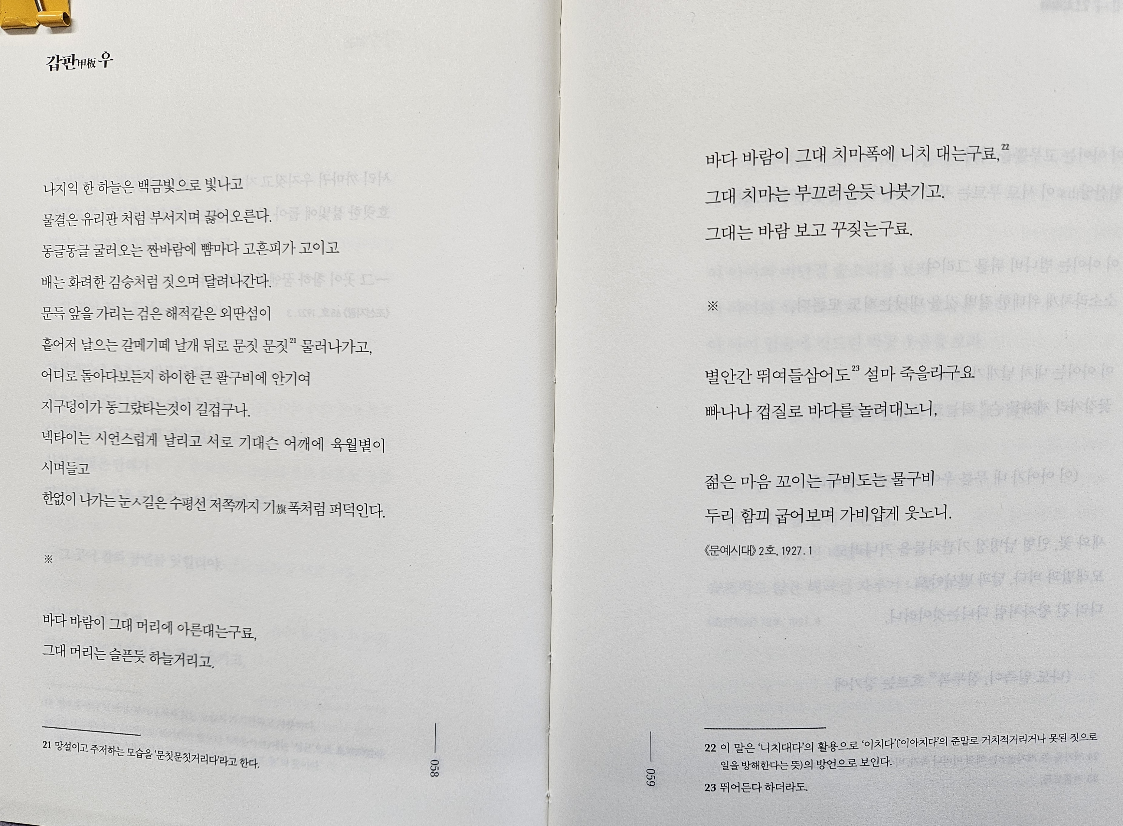 가여운 글자마다 먼 황해가 남설거리나니.