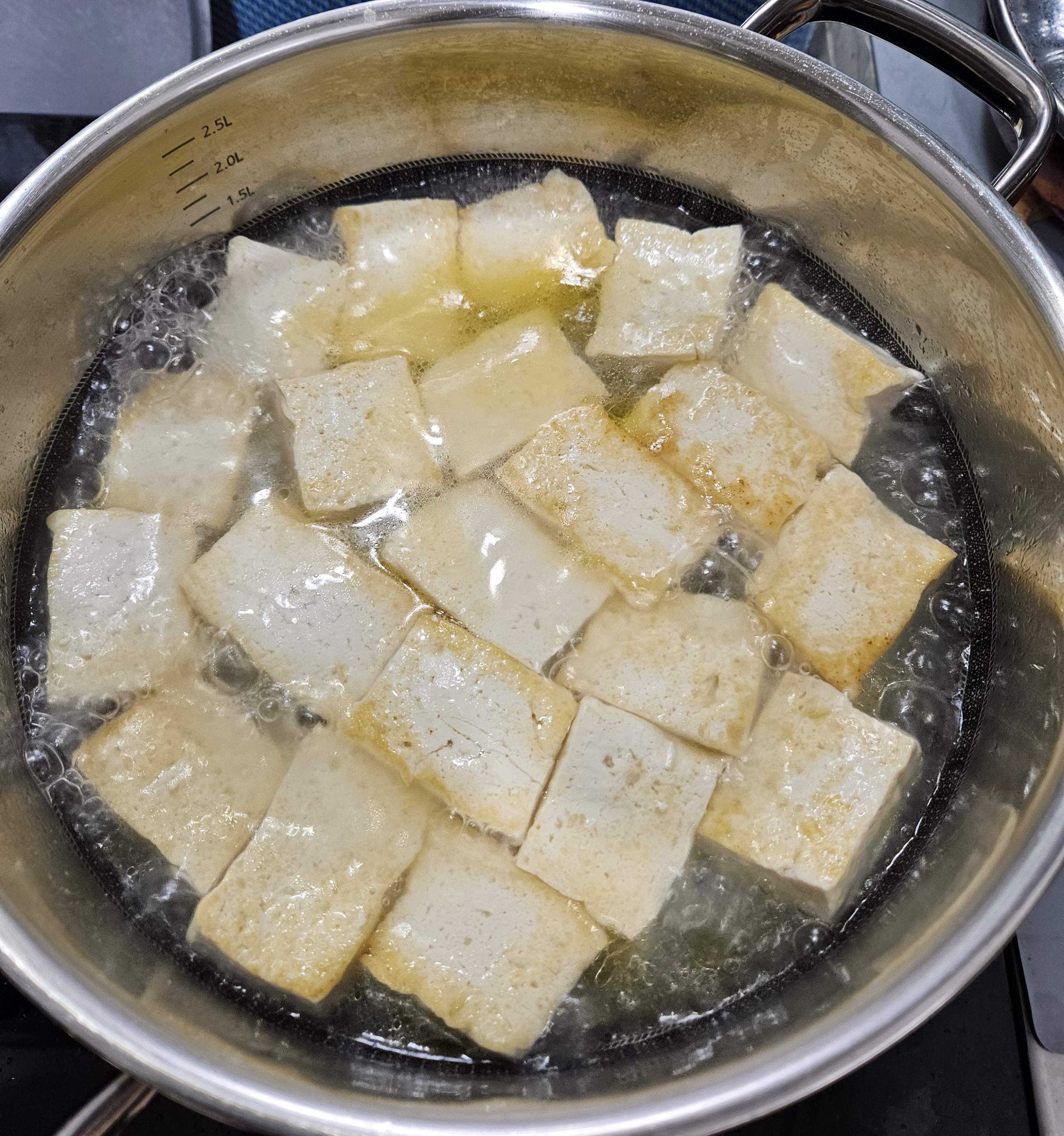 부친 두부를 전골냄비에 준비한 물과 함께 넣고 끓인다.