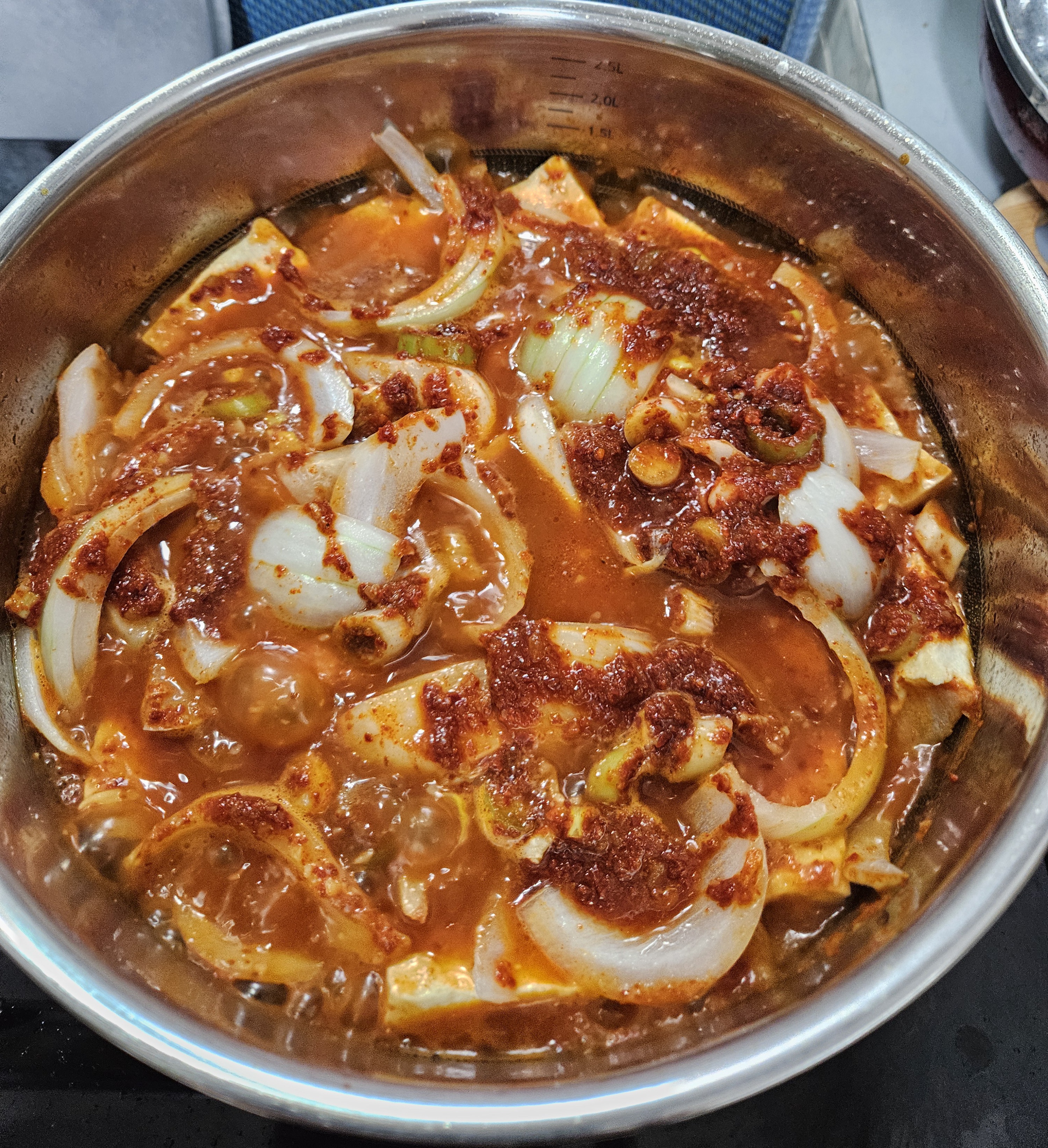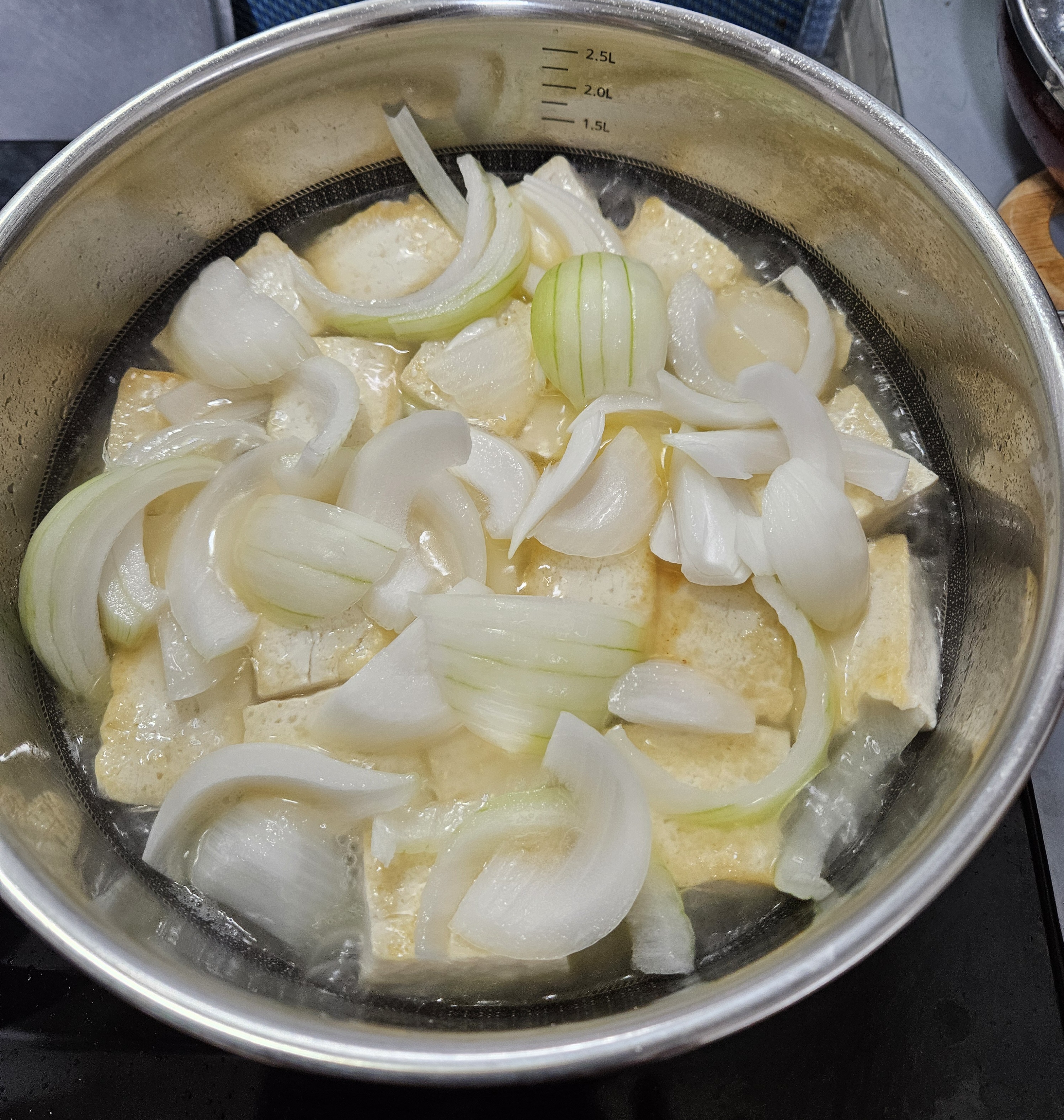 두부 위에 채 썬 양파를 먼저 올려놓고 끓인다.