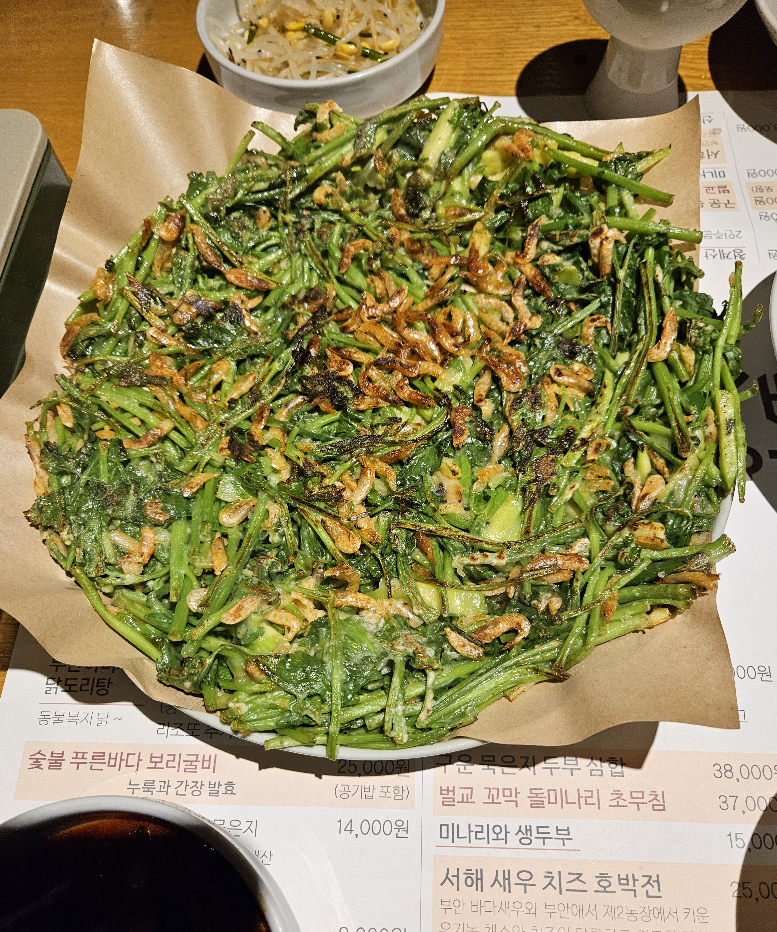 보리새우를 듬뿍 올린 돌미나리전은 비주얼도 좋지만 부드러우면서도 바삭하고 고소한 미나리향이 입안 가득 여운이 감도는 식감이다. 우리 일행은 무려 세 판이나 주문하였다.