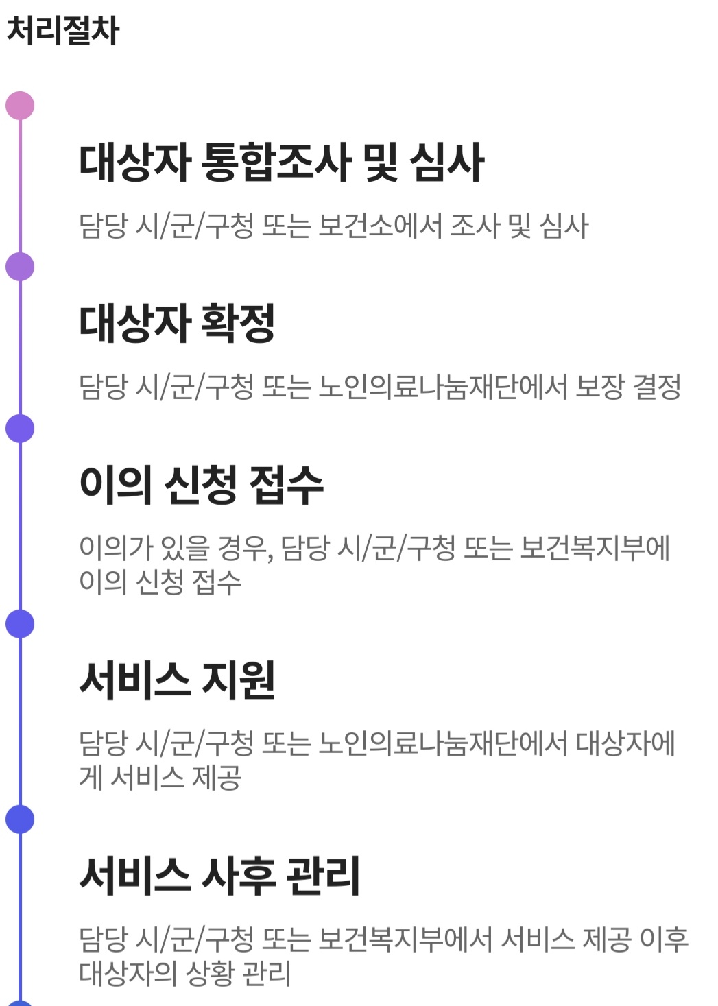 (대상자 통합조사 및 심사 > 대상자 확정 > 이의신청접수 > 서비스 지원> 서비스 사후관리)